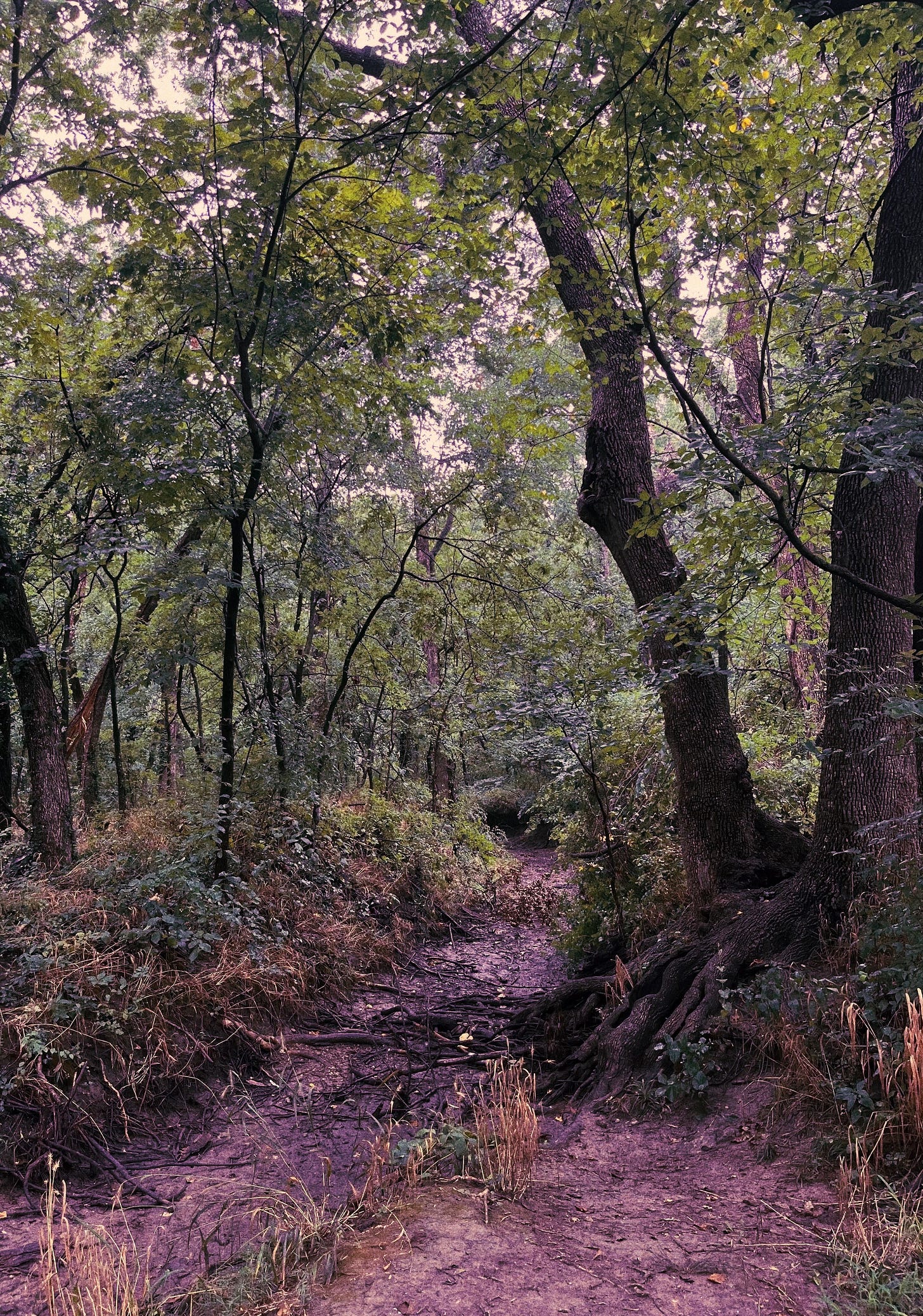 Everything is blooming around me. The air is damp, warm. Overcast skies with beams of light peeking through. Petrichor filling my nostrils with every breath. Muddy terrain under my feet. Trees glistening above from the previous soak. My limbs carry me through the forest, with no destination in sight.